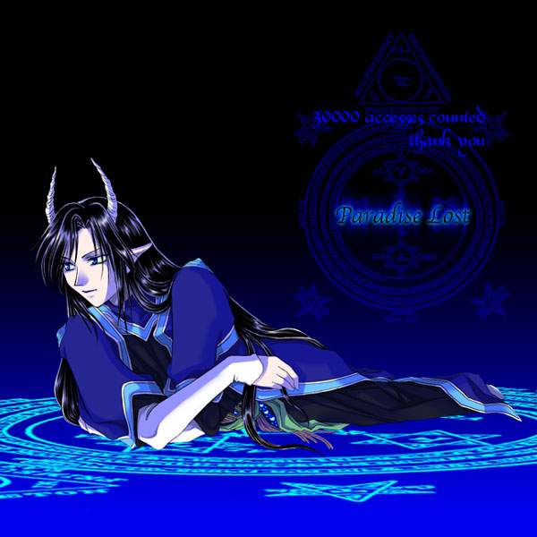 10000HIT区切りの突破記念絵は全てお揃いっぽくしたいと思い描きましたが、サイズが600x600なものの、自分の紋章の上ではなく、召喚用の魔法陣の上にいたりして、微妙な仕上がり。Paradise Lostの文字などなど、文字はお揃いにしてみました。